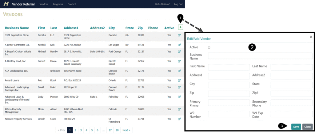 - View the list of vendors alphabetically by business name, first name, last name, address or city.