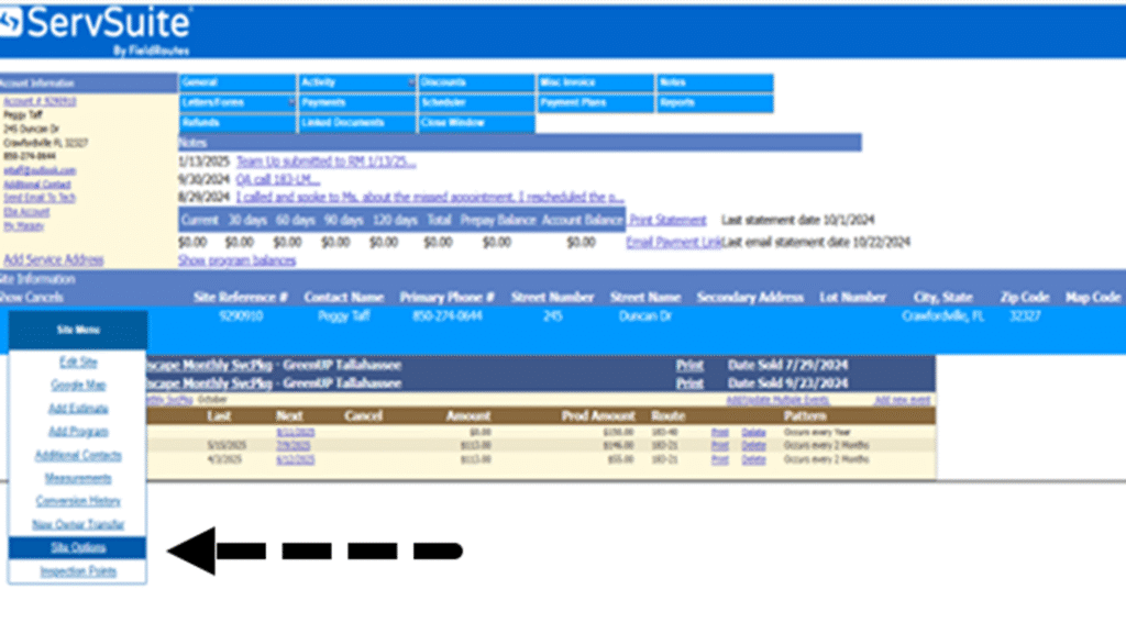 - Enter the vendor name, discount program (HRIS) and service start date in the site menu/site options section on the customer’s ServicePRO account. (see Example #2)
