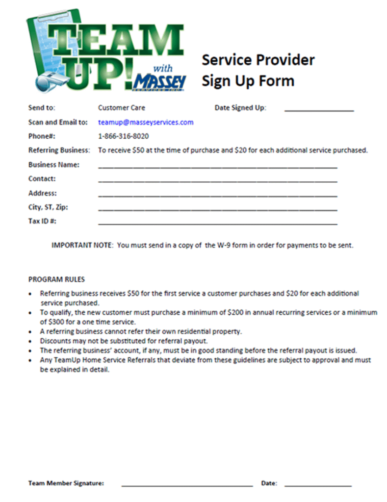 - A TeamUp referred Massey Services Inc., customer with only a pre-treat service will be treated as a “new customer” in the TeamUp program.