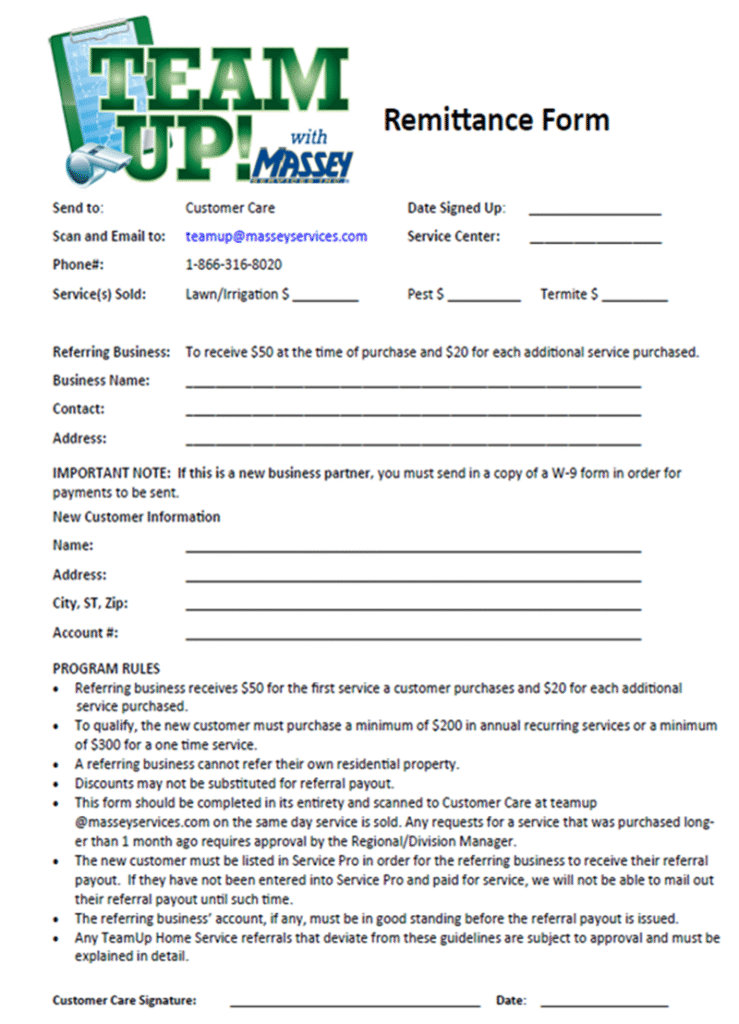 - The Remittance Form must be completed in its entirety and emailed to Customer Care at teamup@masseyservices.com for fulfillment.