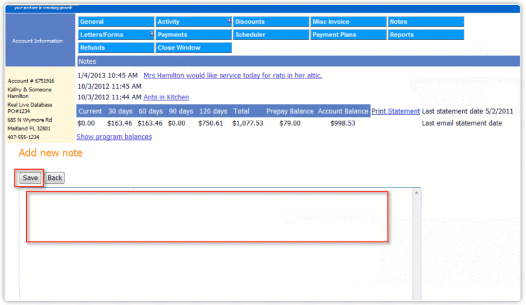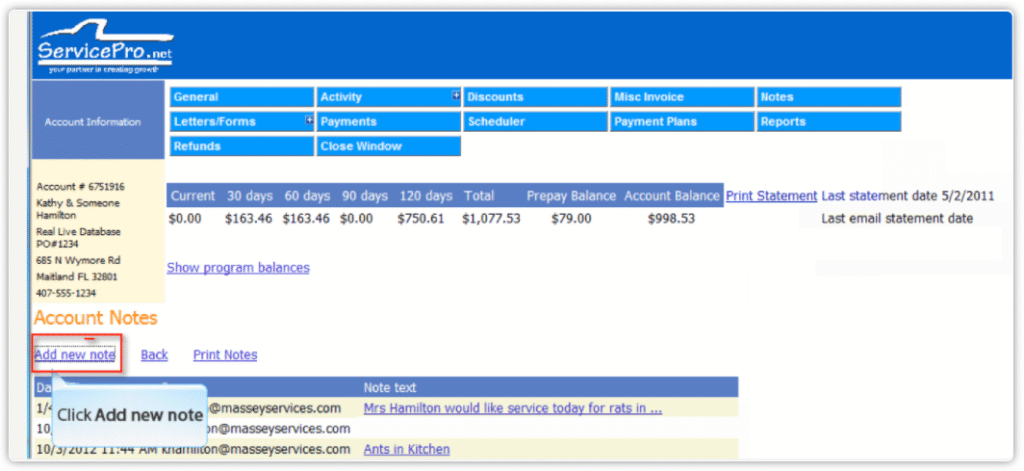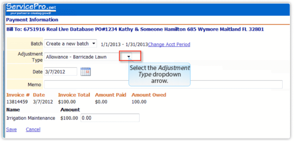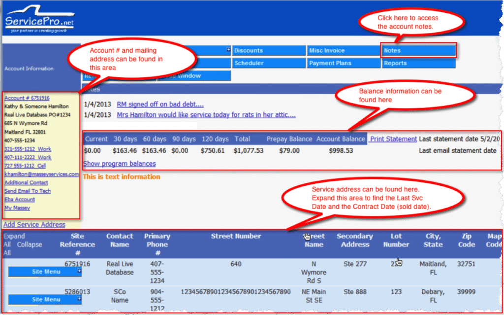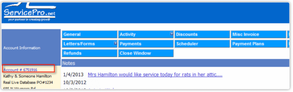 - Login to ServicePro and search for the account from the Home screen. Locate the account in the search results. Once you have accessed the account in ServicePro you will perform the following steps to make the bad debt adjustment: