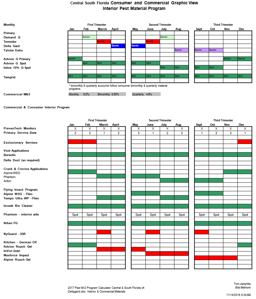 Some training materials include reference charts showing the treatment schedule by trimester, including product types and timing. These visuals reinforce rotation and seasonal application planning.