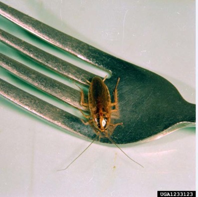 German cockroaches contaminate food, food-contact surfaces, utensils, and storage areas through feces, cast skins, regurgitated materials, and defensive secretions. These contaminants can introduce or spread pathogenic microorganisms, creating significant health risks in both residential and commercial environments.