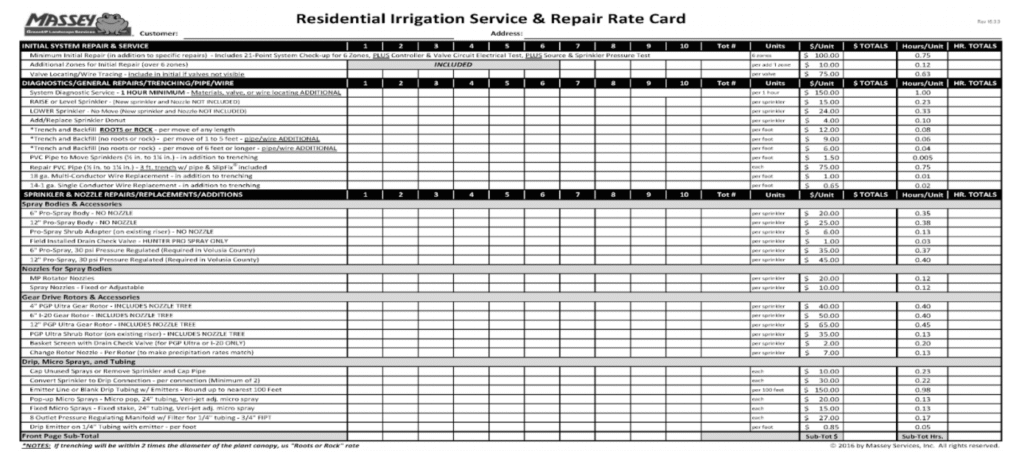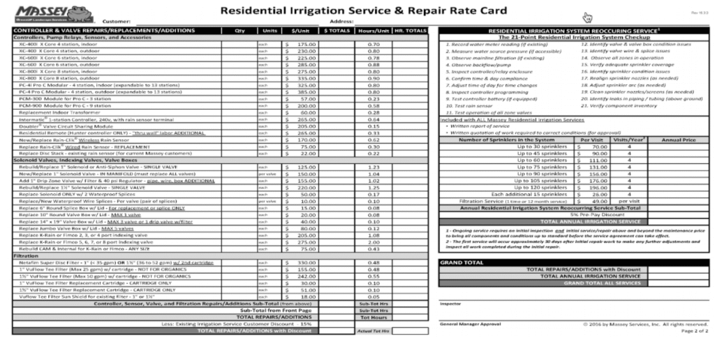 This version of the Residential Irrigation Rate Card (see exhibits) has a new tool added to it called labor hours. This tool is to be used in three different ways to aid in the selling, execution, and managing of the irrigation service business: