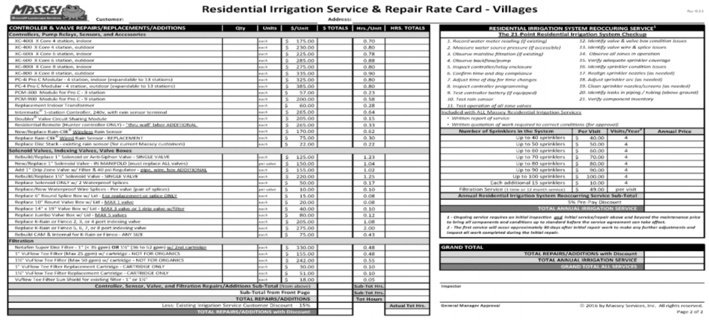 - The Residential Irrigation Rate Card is NOT to be used to quote commercial irrigation systems. The pricing is not correct to cover the scope and scale required to complete the work on commercial systems.
